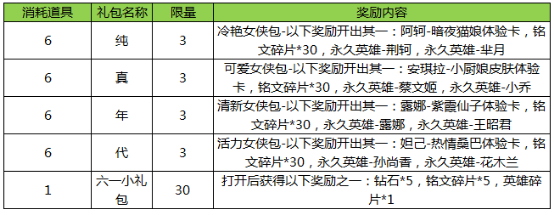 1个【六一】小礼包,可以开出以下奖励之一:钻石*5,铭文碎片*5,英雄碎片*1,可兑换30次。