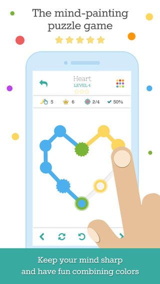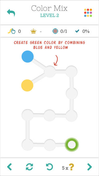 水彩画(Watercolors)是一款创意类的解密游戏。游戏中要求玩家划线将不同的两点连接起来,而划出的线条必须在方格内给出的路径中进行选择。每个格子还会带出不同颜色,游戏的机制还要求玩家在解谜的同时混合各种颜色创作出新的图形。比如,做出游戏要求的绿色,玩家需要混合黄色和蓝色。