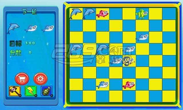 将5条或者5条以上相同的小鱼相连即可消除,点击某条小鱼表示选中,再次点击屏幕上的棋盘区域,若中间无障碍,则可以将选中的小鱼移动至该区域。